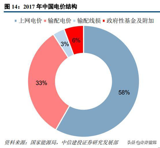 我國銷售電價構成主要包括上網電價、輸配電價、輸配線損和政府性基金及附加。根據發(fā)改委2017年電力價格監(jiān)管相關通告數據,電網企業(yè)平均含稅銷售電價為0.6091元/千瓦時(不含政府性基金及附加)。對于下游用戶綜合用電電價而言,其由發(fā)電企業(yè)上網電價(0.3763元/千瓦時)、輸配電價(0.2107元/千瓦時)、輸配電線損(0.02213元/千瓦時)和政府性基金及附加(0.0366元/千瓦時),合計為0.6457元/千瓦時。從占比來看,上網電價、輸配電價、輸配線損和政府性基金及附加占比分別為58%、33%、3%和6%。