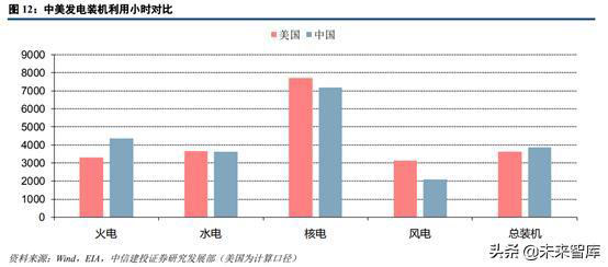 從中美發(fā)電裝機利用小時對比來看,由于美國火電裝機中燃機占比較高,所以其總裝機利用小時和火電利用小時均低于中國。其核電及風電受益于消納條件較好及資源稟賦,利用小時高于中國。