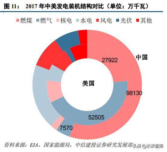 除火電裝機結構分化外,中國第二大發(fā)電機組為水電,占比達19.3%,較美國水電裝機占比高出12.6個百分點;美國核電為其第三大發(fā)電電源,裝機達10479萬千瓦,占比8.8%,較中國核電裝機占比高出6.8個百分點;中國風電、太陽能裝機占比分別為9.2%和7.3%,分別較美國風電、太陽能裝機占比高出1.7、5.1個百分點。