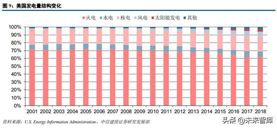 美國發(fā)電量結構變化情況與中國較為類似,火電發(fā)電量占比從2001年的71.7%下降到2018年的62.1%。核電、水電分別是美國的第二和第三大發(fā)電電源,兩者占比相對穩(wěn)定。風電及太陽能對火電的替代效應較為明顯。中美發(fā)電量數據的不同之處在于美國火電及核電發(fā)電量多年來幾乎維持零增長,風電及太陽能以搶占少量的新增用電需求為主;而中國各項電源占比結構雖然有所分化,但各類電源發(fā)電量仍然維持正增長。