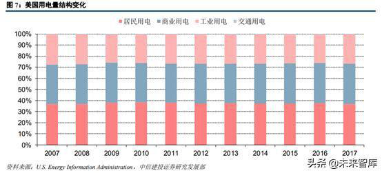 目前美國用電量基本上穩(wěn)定在37000億千瓦時(不考慮1400億千瓦時的廠用電及線損)左右。美國用電結構劃分與中國有所不同,其用電劃分為居民、商業(yè)、工業(yè)及交通,2017年分別占總用電量比例為37%、36.3%、26.4%和0.2%。從趨勢上看,工業(yè)占比有小幅下滑,但整體用電結構保持相對穩(wěn)定。