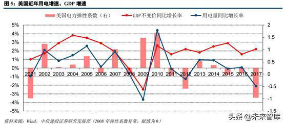 從美國的GDP增速、用電增速和電力彈性系數的變化情況來看,美國作為發(fā)達國家,其經濟增長與用電增速相對較為穩(wěn)定,波動幅度遠小于中國。2011年以來,美國GDP增速保持2%左右波動,而用電增速在±1%的區(qū)間內窄幅震蕩,用電量增長和經濟增長基本沒有明顯相關性。從電力彈性系數也看出,美國電力彈性系數較為無序,預示其經濟增長對電力消費推動的影響明顯減小。