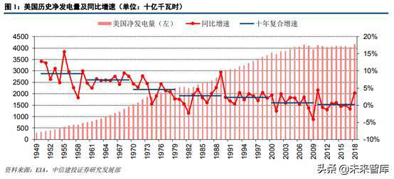 我們首先分析中美歷史發(fā)電量變化情況,以期對兩國電力產業(yè)當前所處階段做出初步判斷。從美國近七十年的凈發(fā)電量數據來看,盡管年際間發(fā)電增速起伏不定、波動較大,但以十年為一個周期,美國的凈發(fā)電量復合增速呈現穩(wěn)步下臺階的趨勢。
