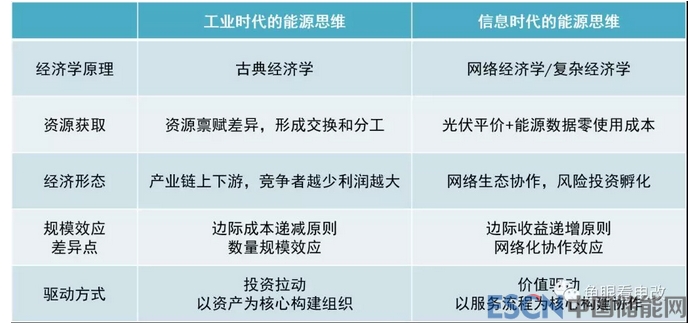 工業(yè)時(shí)代的能源思維和信息時(shí)代的能源思維,個(gè)人認(rèn)為在以下這些方面是不同的:
