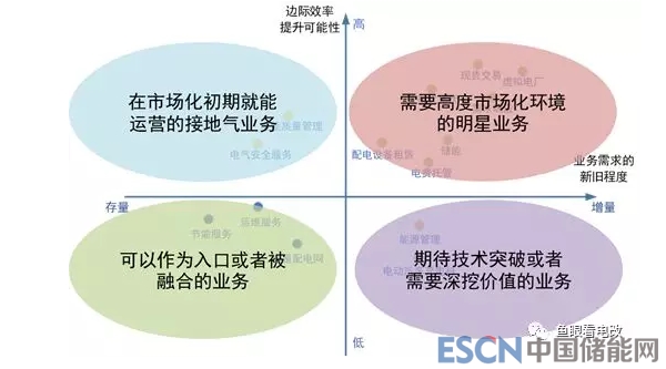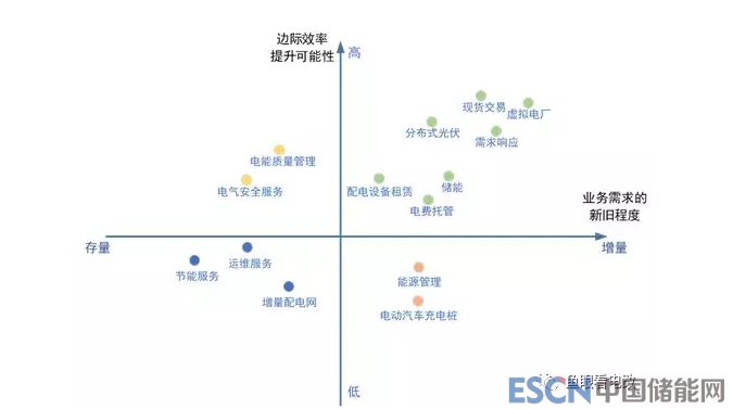 就商業(yè)模式來(lái)說(shuō),我們肯定覺(jué)得“新的需求+高邊際效率”的業(yè)務(wù)(右上角象限)是最有前途的,互聯(lián)網(wǎng)企業(yè)的打法也都是聚焦在這個(gè)象限。但是就電力行業(yè)來(lái)說(shuō),這個(gè)象限并不是所有的業(yè)務(wù)都馬上能落地的,原因是:電力或者能源行業(yè)并未如零售消費(fèi)端那樣徹底市場(chǎng)化,其結(jié)果就是業(yè)務(wù)受政策影響很大,不確定性很高。比如儲(chǔ)能業(yè)務(wù),可能工商業(yè)電價(jià)一下降,或者工商業(yè)可轉(zhuǎn)為兩部制電價(jià)的政策一落地,工商業(yè)儲(chǔ)能業(yè)務(wù)的短期風(fēng)險(xiǎn)就會(huì)快速增加。