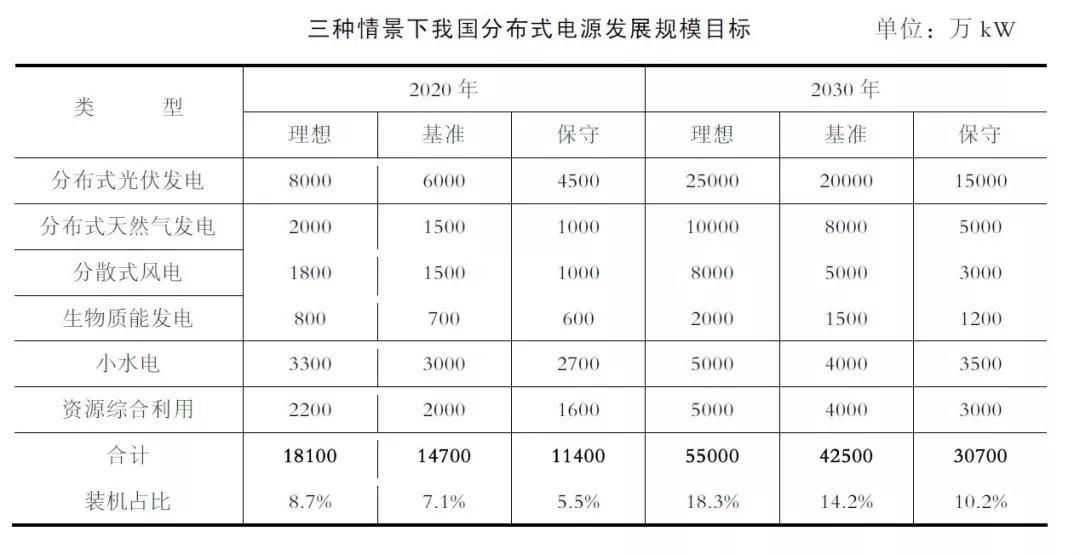 根據(jù)國家《能源發(fā)展“十三五”規(guī)劃》《2014—2020 年能源行動計劃》《可再生能源發(fā)展“十三五”規(guī)劃》《電力發(fā)展“十三五”規(guī)劃》相關(guān)內(nèi)容,2020 年分布式光伏發(fā)電、分布式天然氣發(fā)電開發(fā)規(guī)模達到國家規(guī)劃目標,2030 年分布式光伏發(fā)電、分布式天然氣發(fā)電開發(fā)規(guī)模應(yīng)滿足實現(xiàn)國家戰(zhàn)略目標的要求;分散式風電、生物質(zhì)能發(fā)電、小水電和資源綜合利用開發(fā)規(guī)模達到相關(guān)規(guī)劃或資源量約束目標。