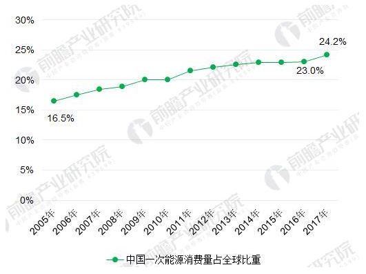 圖表6:2005-2017年中國大陸一次能源消費(fèi)總量占全球比重變化(單位:%)