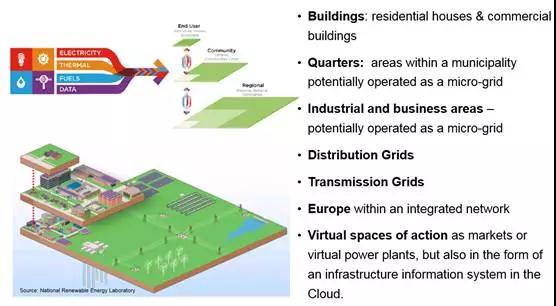 一個“細(xì)胞結(jié)構(gòu)”的基本功能是為位于其中的用戶供應(yīng)能源,將來還需要進(jìn)一步開發(fā)供能系統(tǒng)的靈活性。而多能互補(bǔ)(電,熱,交通等)可以實(shí)現(xiàn)一個細(xì)胞結(jié)構(gòu)內(nèi)的整體優(yōu)化。該細(xì)胞結(jié)構(gòu)可以通過分布式能源、生產(chǎn)者與消費(fèi)者之間的互動,應(yīng)對電網(wǎng)日益增長的復(fù)雜性。能源流和IT設(shè)施將不同基礎(chǔ)元素連接起來,保證信息和能源的安全流動互通。