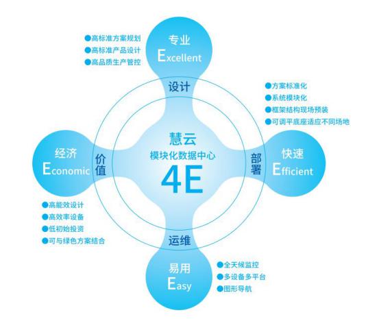 科華恒盛作為大數(shù)據(jù)環(huán)境解決方案及服務(wù)領(lǐng)先提供商,基于專業(yè)(Excellent)、快速(Efficient)、易用(Easy)、經(jīng)濟(jì)(Economic)的“4E”原則,在設(shè)計、部署、運(yùn)維、價值全流程為客戶提供全生命周期管理與服務(wù),打造安全高效、智能云化的新一代“慧云”模塊化數(shù)據(jù)中心。