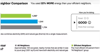 Opower通過自己的云平臺和數(shù)據(jù)整合能力來處理它所服務(wù)的公用事業(yè)公司取得的大量家庭能耗數(shù)據(jù),結(jié)合“行為科學理論”、房齡信息、周邊天氣等,運用自己的軟件系統(tǒng)進行用能分析,簡歷家庭耗能檔案,并通過綜合分析提出節(jié)能建議。最吸引用戶眼球的地方是,Opower提供的報告里,除了用戶本身的用電數(shù)據(jù),還有相近區(qū)域內(nèi)最節(jié)能的20%的用戶耗能數(shù)據(jù),也就是所謂的“鄰里用電比較”,這提供給用戶非常直觀的節(jié)能動力。