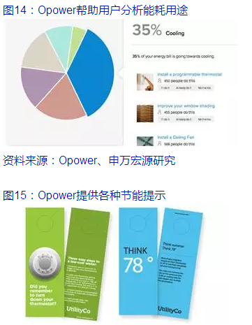 Opower服務(wù)傳統(tǒng)公用事業(yè)公司,推動節(jié)能的互聯(lián)網(wǎng)應(yīng)用,搶占家庭消費者“入口”。美國家庭能源數(shù)據(jù)分析公司Opower采取與傳統(tǒng)電力企業(yè)合作的模式,獲取家庭消費者的能源使用數(shù)據(jù),為傳統(tǒng)電力企業(yè)提供消費者管理服務(wù)以及節(jié)能方案,幫助業(yè)務(wù)陳舊的電力企業(yè)渡過轉(zhuǎn)型期。Opower提供的節(jié)能方案包括通過移動端推送能源賬單,群發(fā)節(jié)能貼士類郵件,提供管控家用恒溫器的軟件服務(wù),等等。