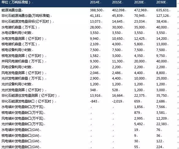 表3:2014-2030年中國的非化石能源消費比重目標